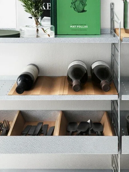 Il portabottiglie String amplia le possibilità d’uso dello String System fino in cucina. I portabottiglie sono realizzati in sughero e sono stati progettati per gli scaffali String metallici: su uno scaffale largo 58 cm è possibile mettere tre portabottiglie e su uno scaffale largo 78 cm quattro portabottiglie. I portabottiglie in sughero sono venduti in confezione da due pezzi e un portabottiglie può ospitare due bottiglie.