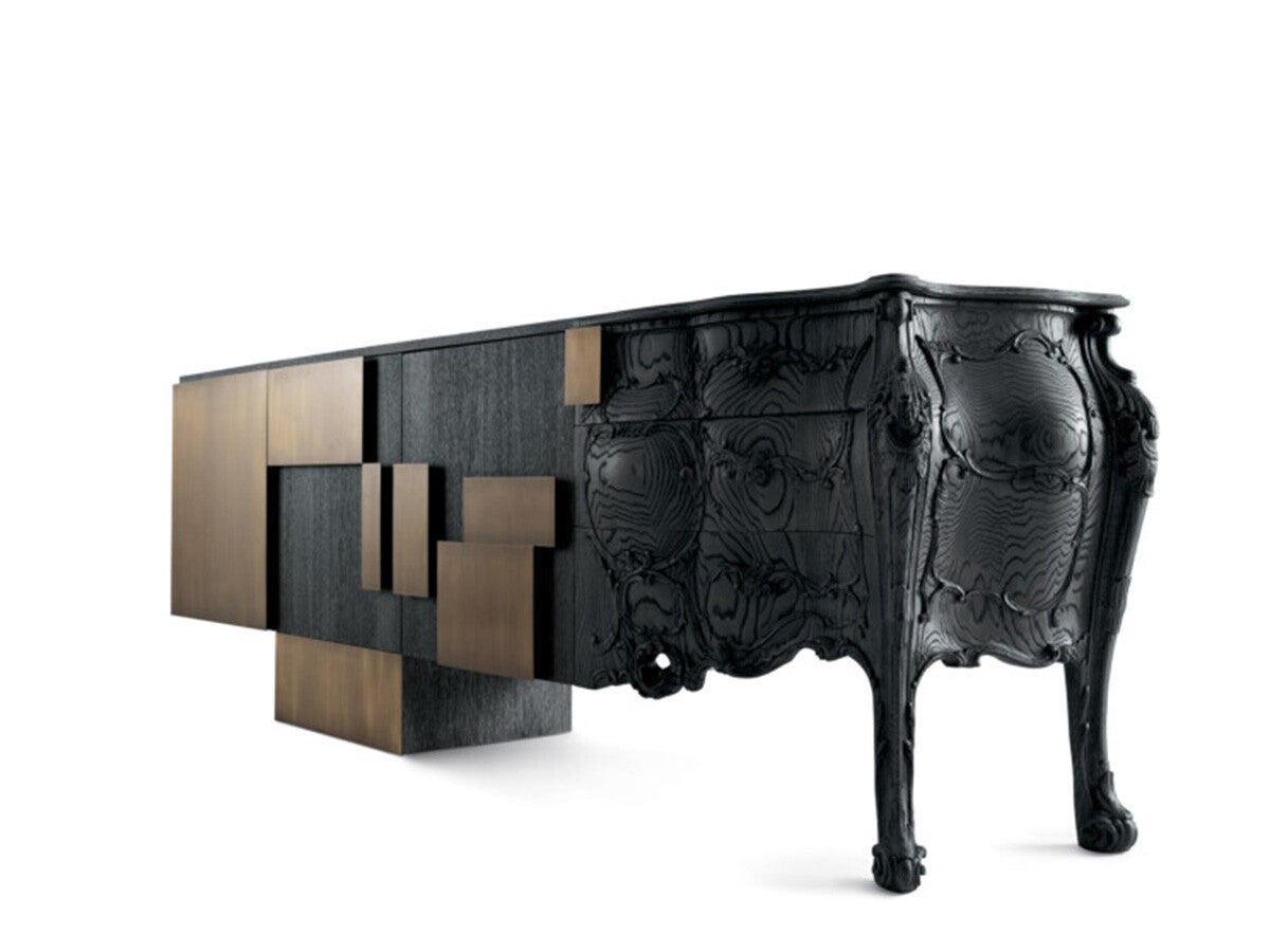 Come da nome, Evolution incarna una tendenza propria di Emmemobili di spingere i confini dell’interior design e soprattutto del product design oltre i limiti del conosciuto, offrendo agli appassionati del settore nuove ispirazioni cui rifarsi per l’arredo della propria casa. Evolution rappresenta un elemento unico e dalla spiccata forza concettuale in quanto incarna mondi e tendenze diversi. Da un lato è visibile l’alta ebanisteria capace di intagliare forme e cesellature uniche, dall’altra la pulizia formale che innesta al legno elementi razionalisti in diversi materiali. Il risultato è stupefacente, un oggetto unico che spicca e si distingue in qualunque ambiente della casa, soprattutto se lasciata libera di essere osservata da tutte le prospettive.